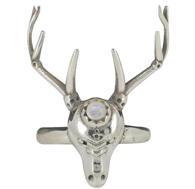 Laissez-vous envoûter par le charme de notre Bague Cerf Mystique, une pièce de joaillerie unique alliant élégance et symbolisme. Cette bague représente une tête de cerf majestueuse aux bois finement sculptés, créant un design à la fois audacieux et gracieux. Le regard du cerf est orné d'une magnifique pierre de lune naturelle, qui capte la lumière avec des reflets bleutés et iridescents. Connue pour ses vertus apaisantes et sa capacité à stimuler l'intuition, la pierre de lune confère une dimension mystique et spirituelle à ce bijou.